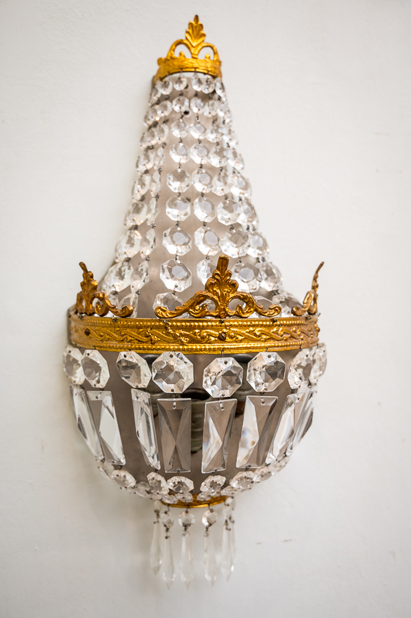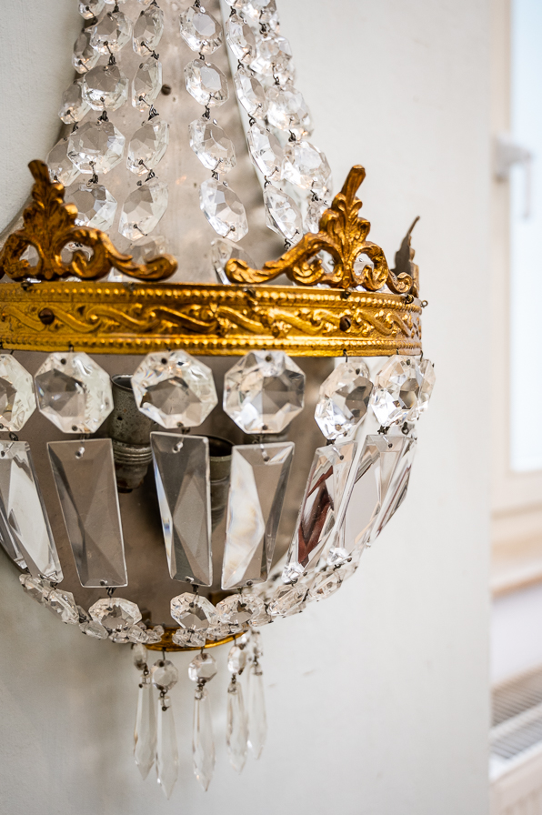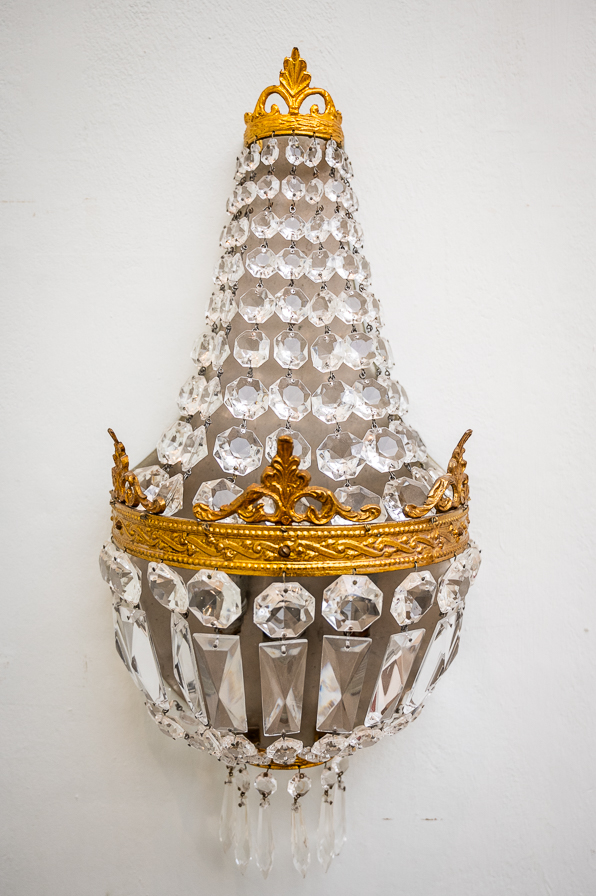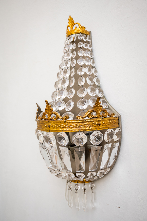 Dieser große exquisite Wandleuchter erstahlt in originalem Habitus. Große Kristalle zieren seinen Körper, gehalten von einem mit Kronen verzierten Messingband. Ein silber verspiegelter Reflexionskörper streut das Licht in den Raum. Drei E14 Fassungen geben die Möglichkeit auf große Helligkeit und bezaubernde Lichtspiele im Raum. Diese Leuchter sind ein edles Accessoires im historischen Raum und ein blickfang in moderner Einrichtung.