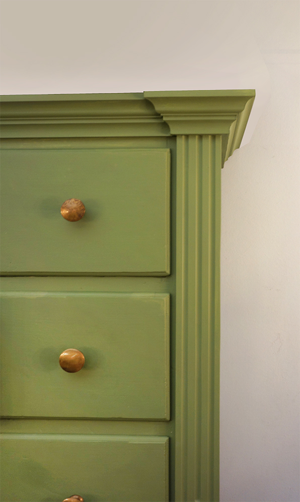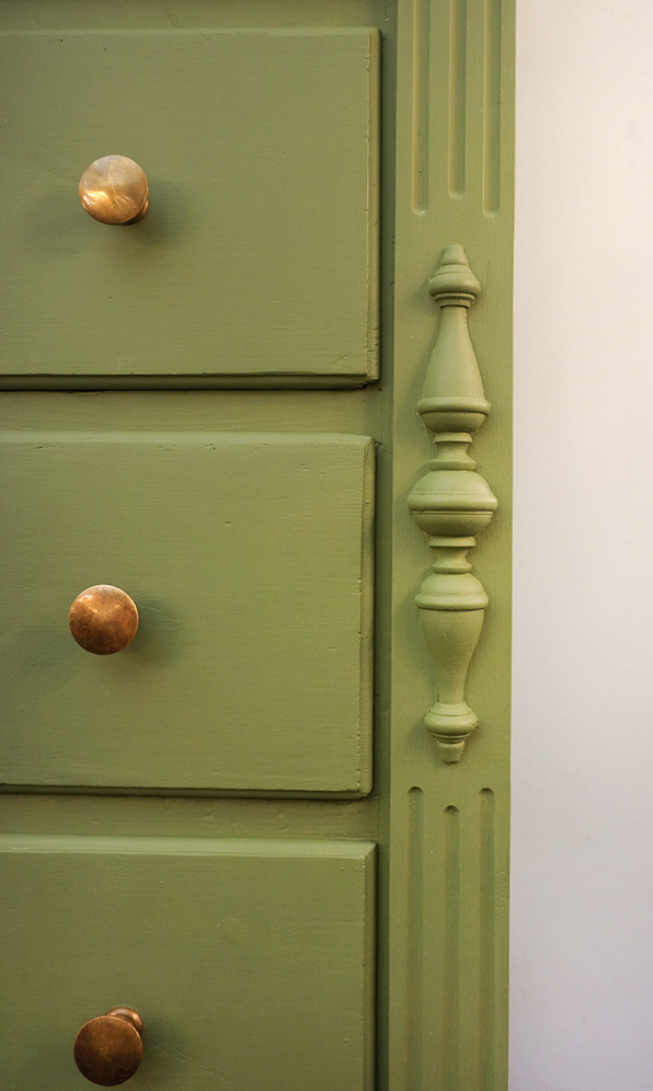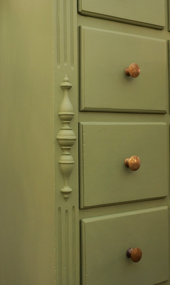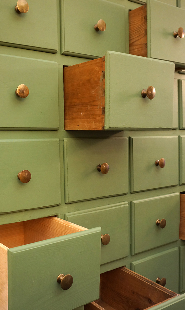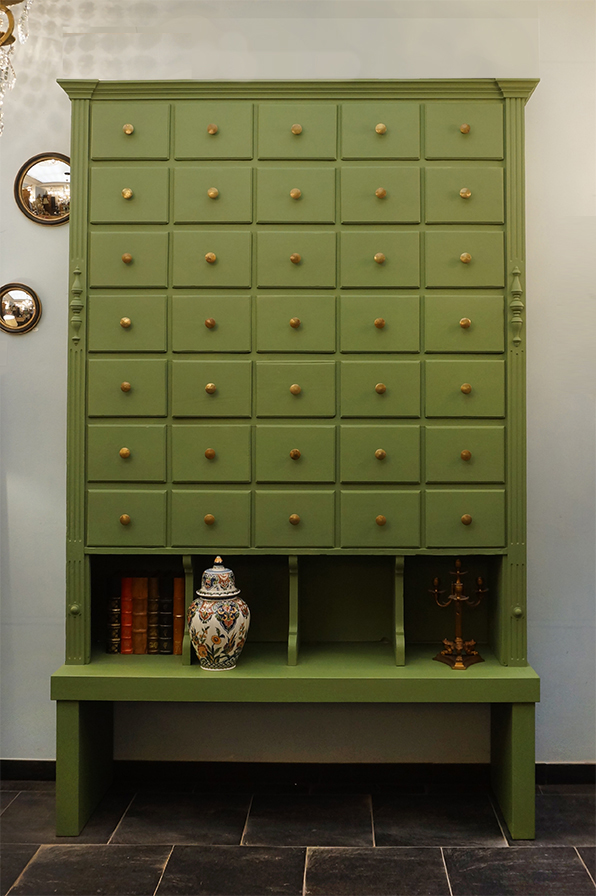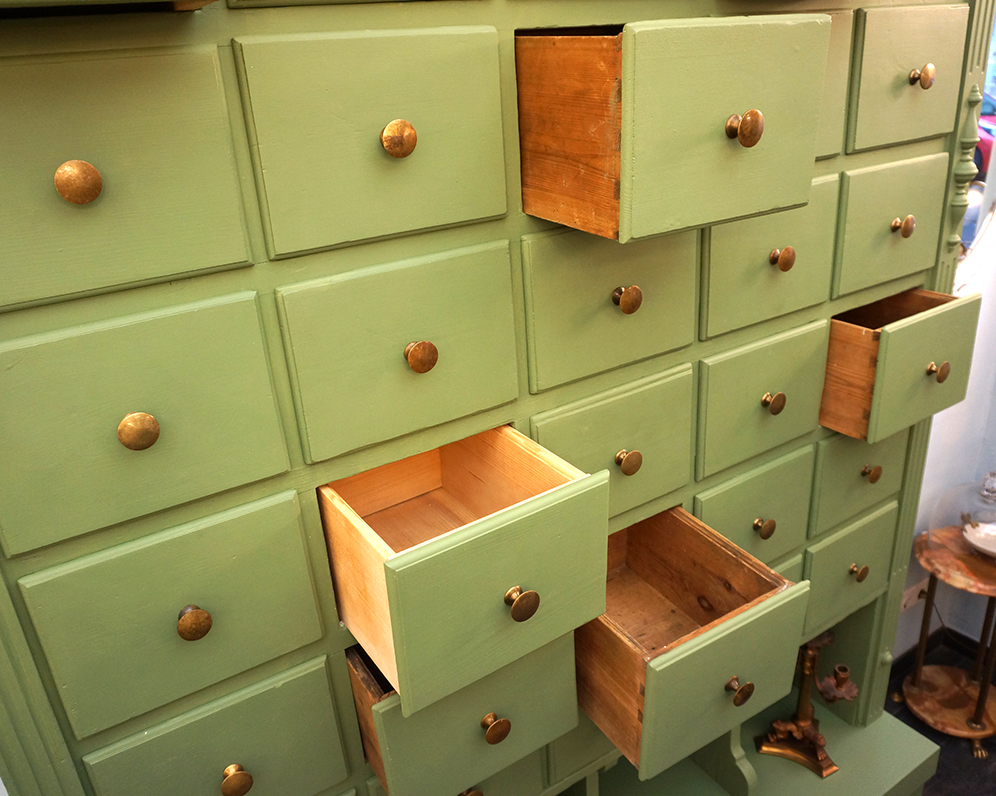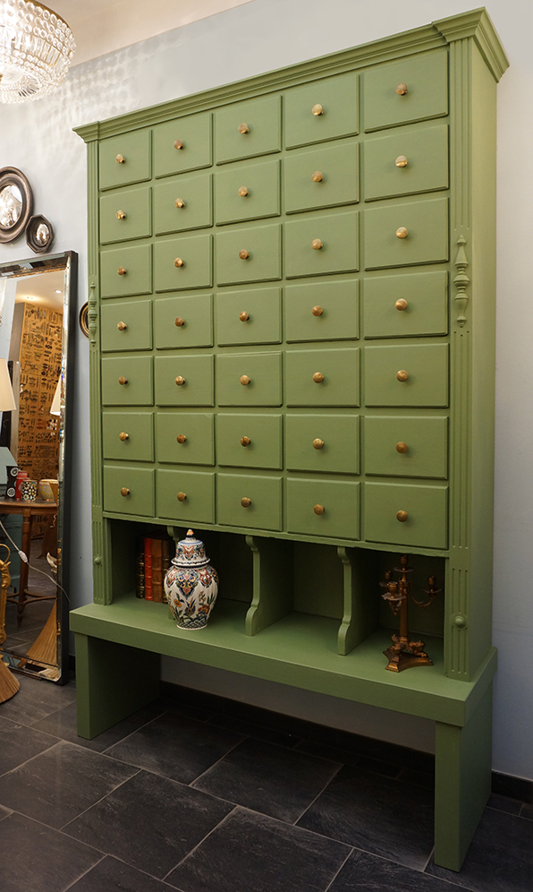 Ein großartiges Schubladenaufsatzregal mit 35 Schubladen und Ablage. Das Regal stammt aus einemalten Kolonialwarengeschäft in Sachsen aus der Gründerzeit. Seine unverkennbare Ausstrahlung erhält das Möbelstück durch die 35 Schubladen, welche so groß sind, das man das Regal auch als Schuhschrank verwenden kann. Umrahmt werden die Fächer mit den damals typischen Kanneluren, insgesamt ist der Schrank in einem schönen Grünton gefasst sind. Das Regal steht auf einer eigens dafür getischlerten Bank, welche man gut als Ablage nutzen kann. Wohnfertig liebevoll für Sie aufgearbeitet.
