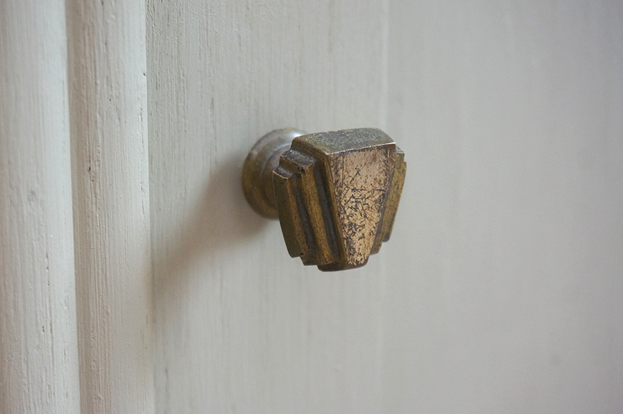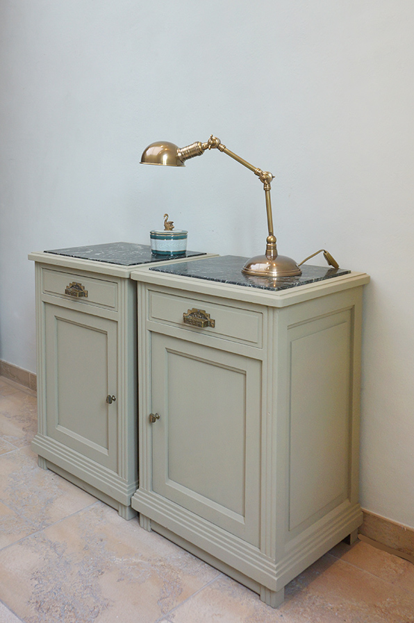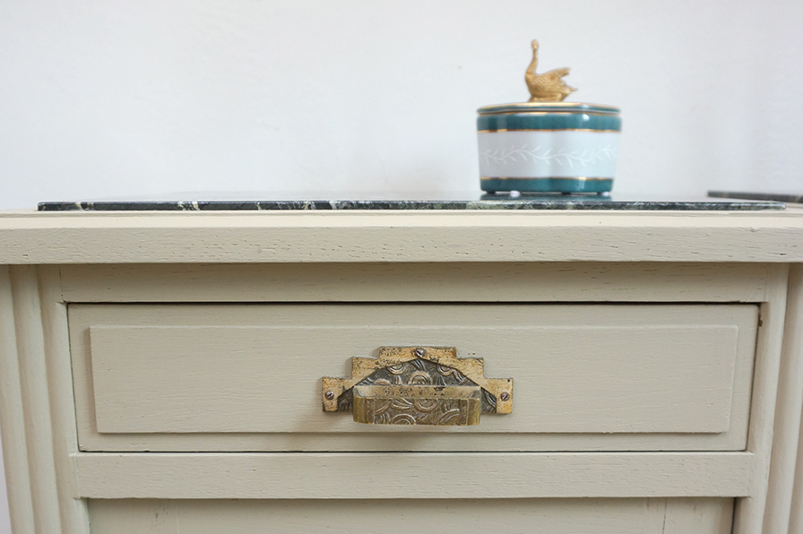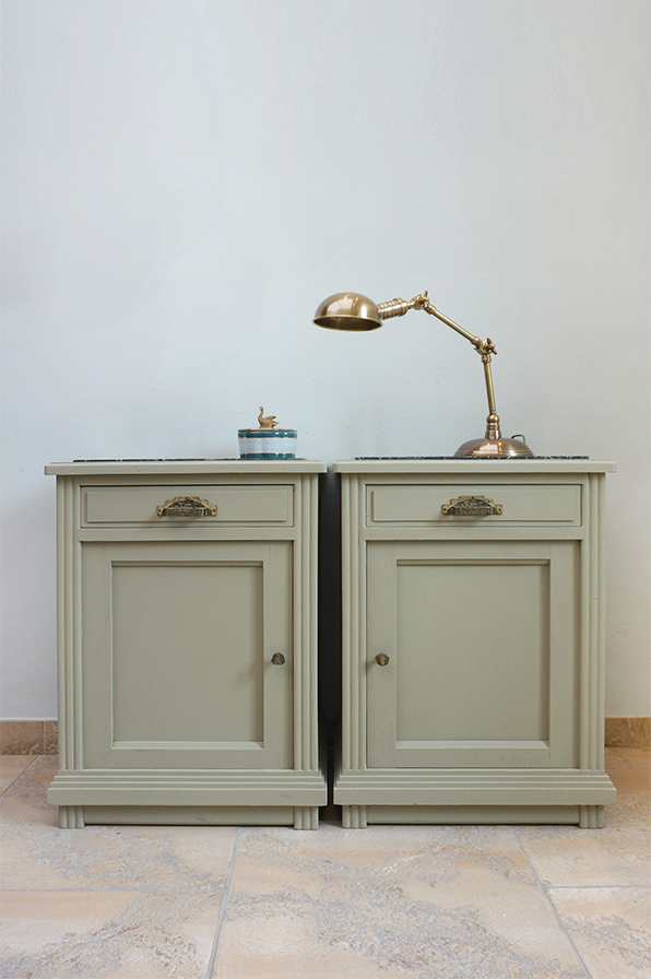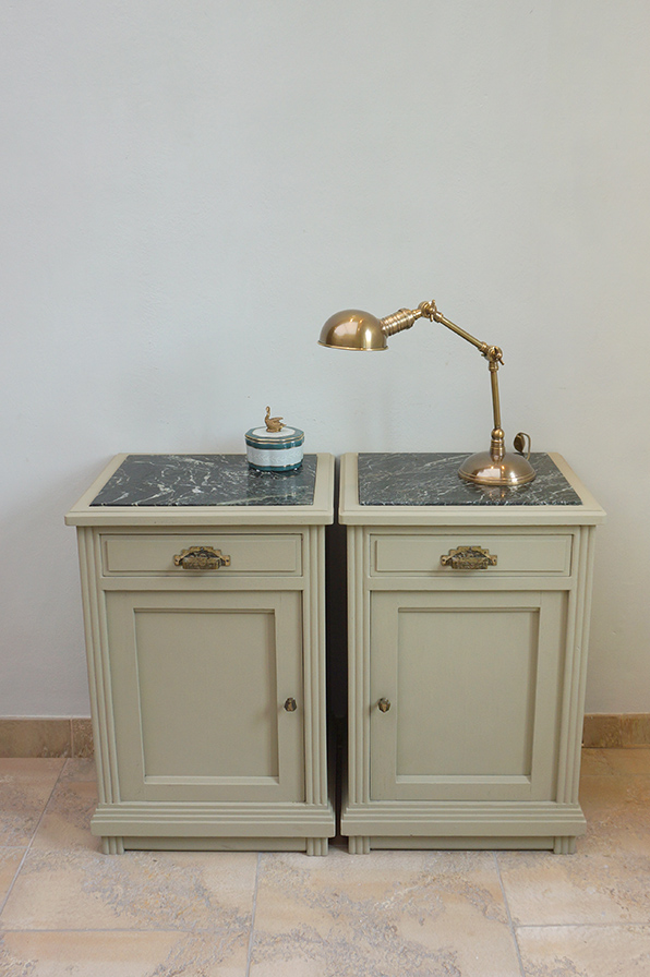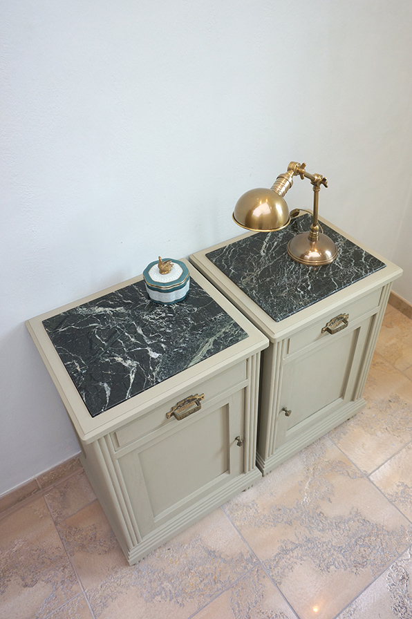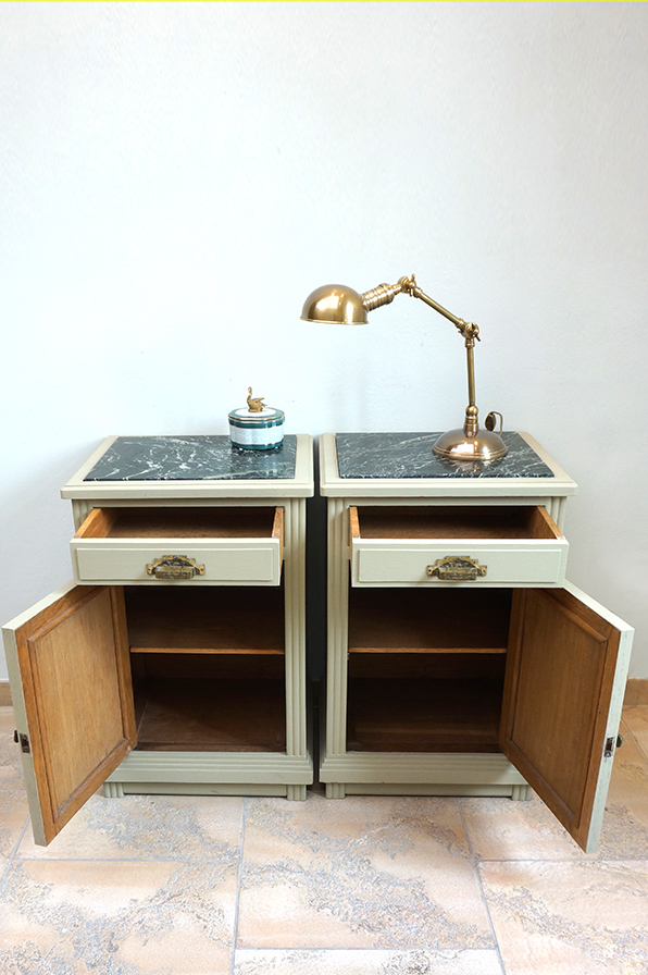 Ein Paar extravagante Nachtschränke aus Eiche in grün-grau gefasst. Die Marmorplatte ist innenliegend schwarz mit grauer Maserung. Ausgestattet sind beide Schränke mit einer Schublade und einer sich gegenständig öffnenden Tür. Wunderbar sind die originalen Griffe und Knäufe original aus der Zeit der Fertigung in den 1920er Jahren.