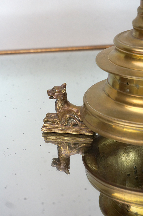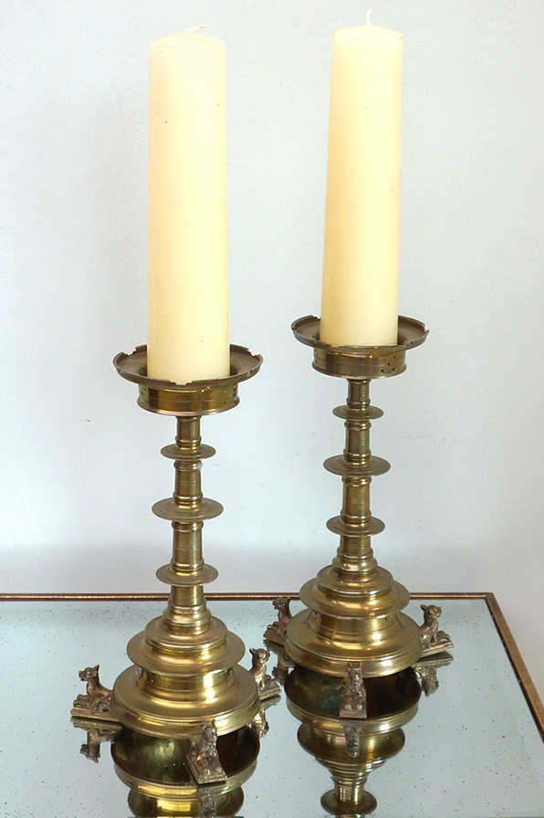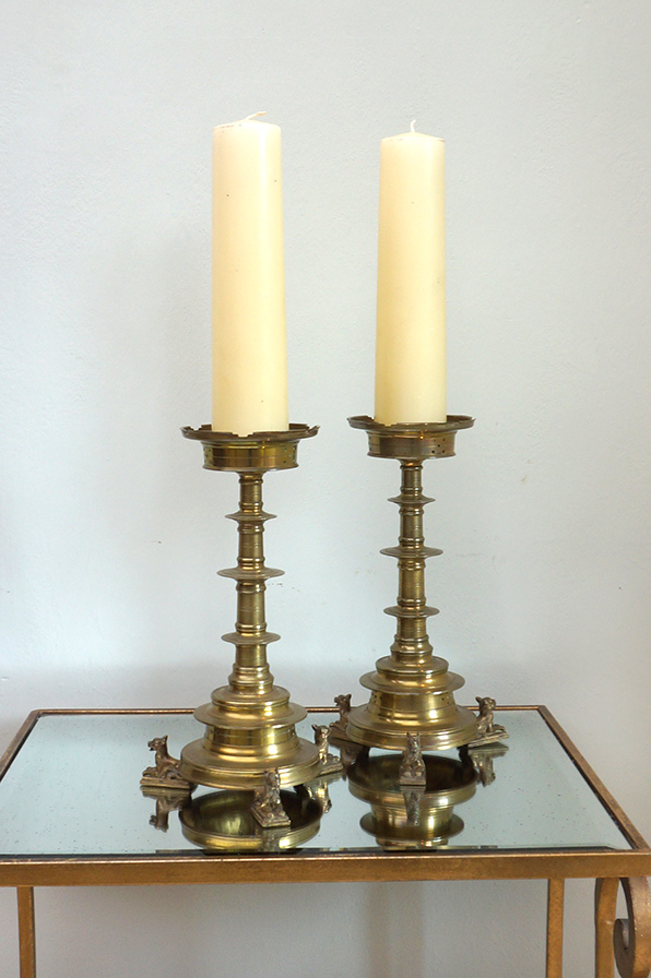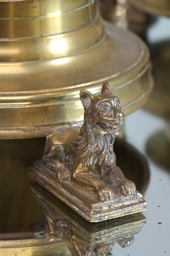 Ein Paar antike Kerzenleuchter aus Goldbonze. Diese Kerzenleuchter zeichnet sich durch eine sehr schöne Formensprache aus. Jeweils drei liegende Löwen stützen den Schaft.
