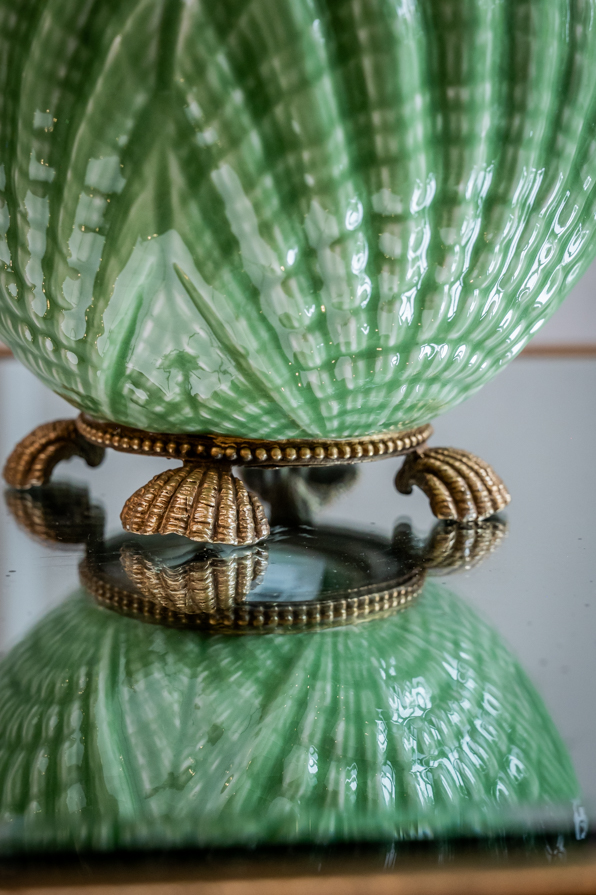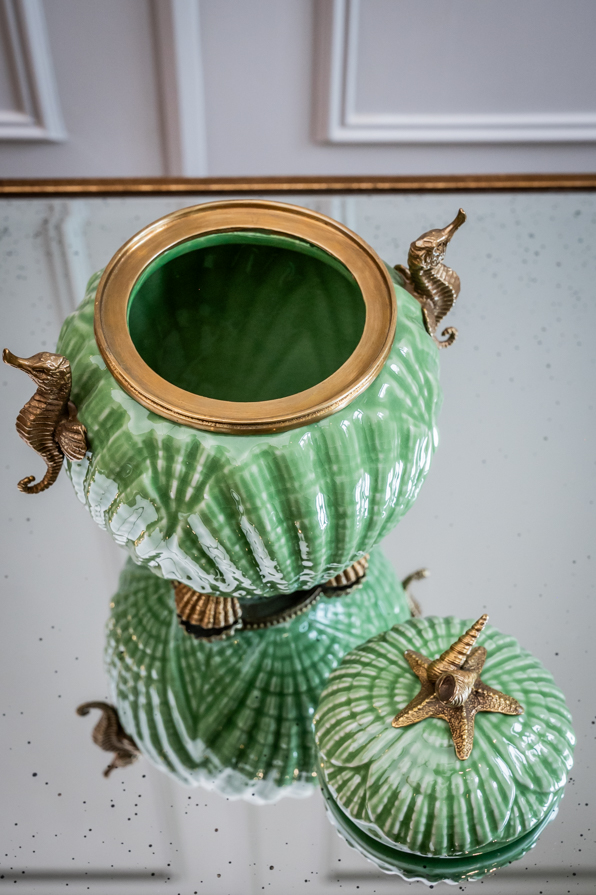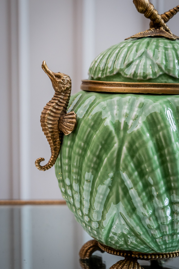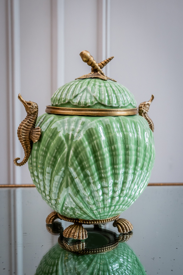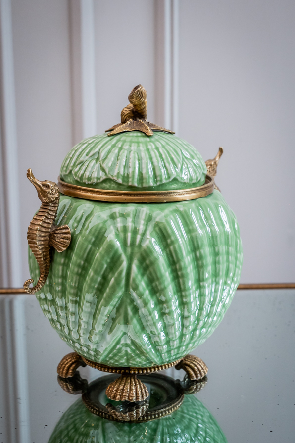 Kostbares Deckelgefäß aus Keramik mit Bronzeeinfassung. Das schöne Gefäß in runder Grundform steht auf 4 Bronzemuscheln in Perlschnur gefasst. Obenauf thront der Seestern mit Kegelschnecken. Beidseitig dienen Seepferdchen als Henkelchen. Ein nützliches Verstaugefäß im Badezimmer, welches Ihnen täglich Freude schenken kann.