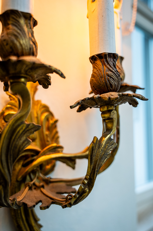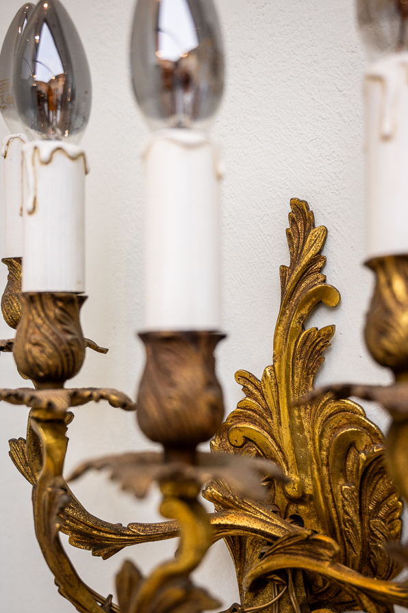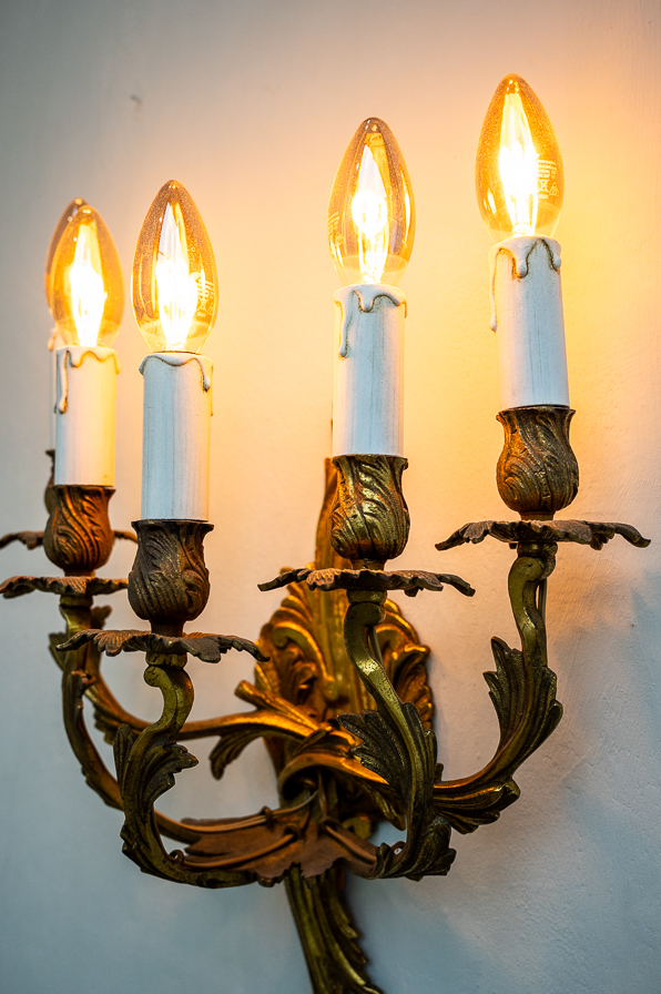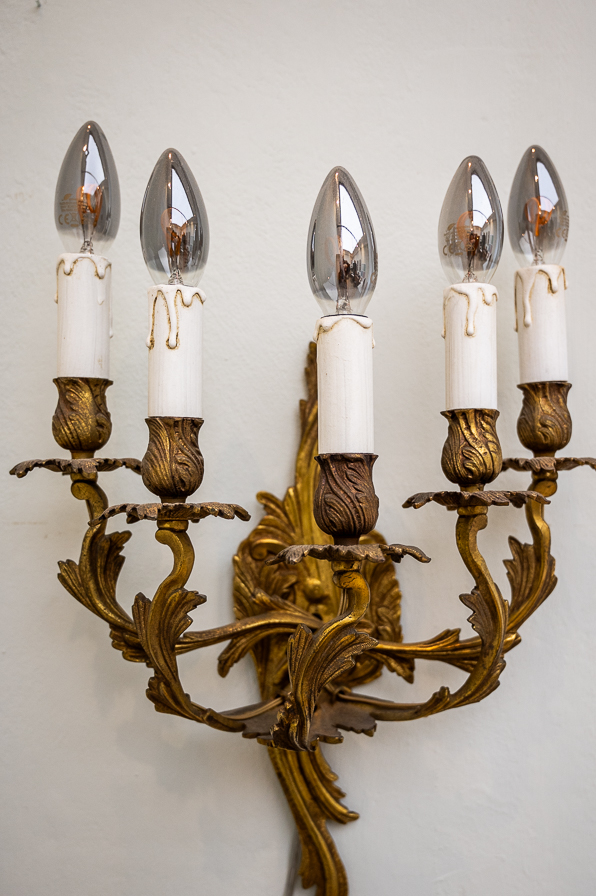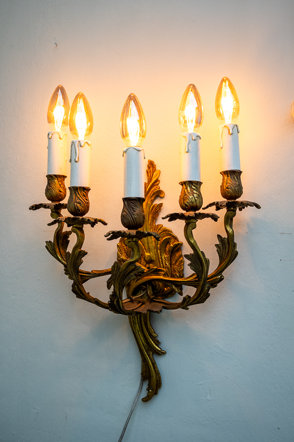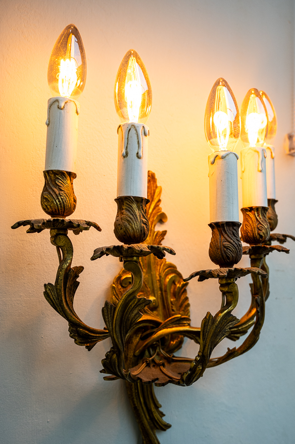 Elegant und mondän zeigt sich dieser fünf-flammige Wandleuchter aus Bronze. Barock verwoben und doch grazil zeigen die Leuchten nach oben sich allseitig ausbreitend entsteht ein warmes Licht, welches hell und gemütlich scheint. Der Leuchter ist über 100 Jahre alt, seine Elektrik neu bearbeitet und geprüft. Ein wunderschöner Leuchter in historischer Umgebung, der die Klasse des Raumes unterstreicht.