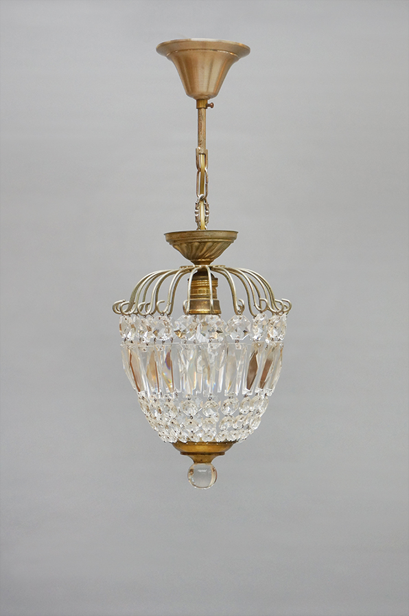Dieser zierliche einflammige Lüster in Eichelform eignet sich hervorragend für einen etwa 15qm großen Raum oder für den Flur. Die Glaskristalle werden durch filigrane geschwungene Messingstreben gehalten und von einem ornamentierten Baldachin bekrönt. An der Unterseite schließt der Lüster mit einer profilierten Messingschüssel und einer Glaskugel ab.