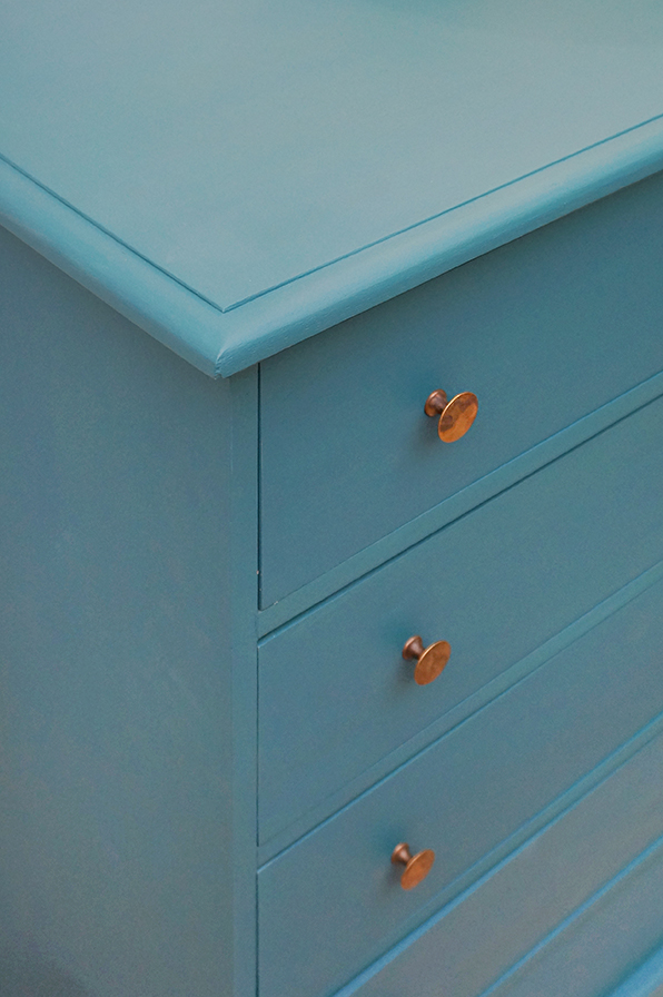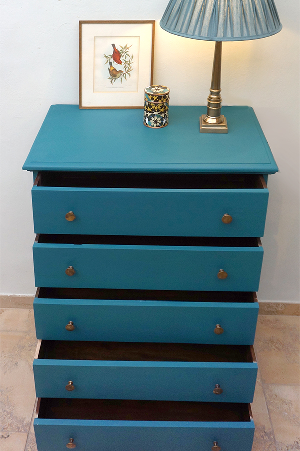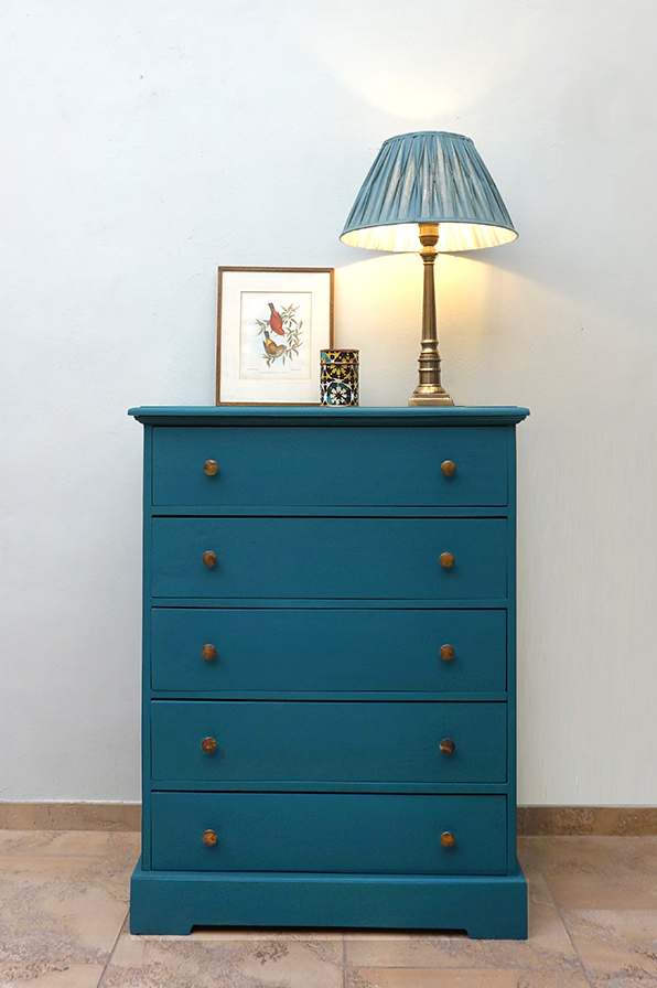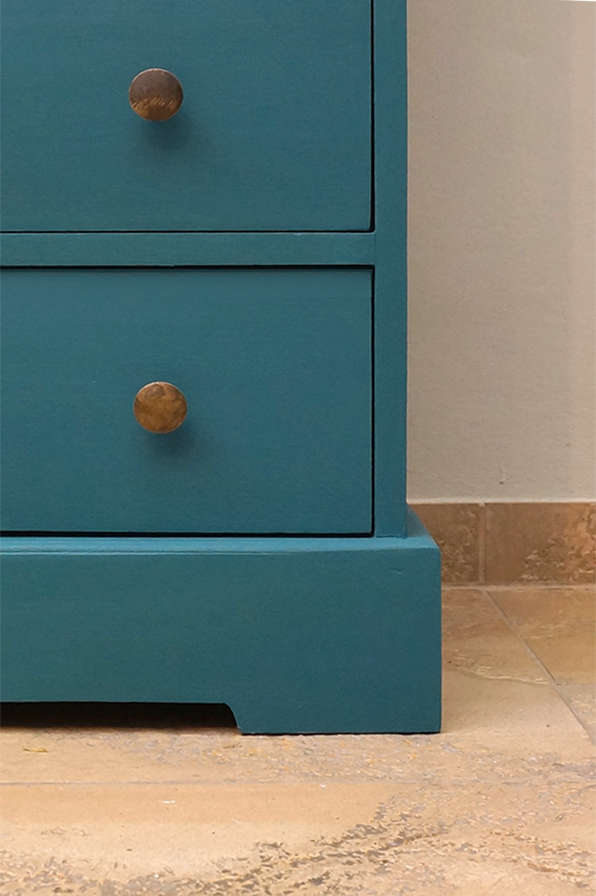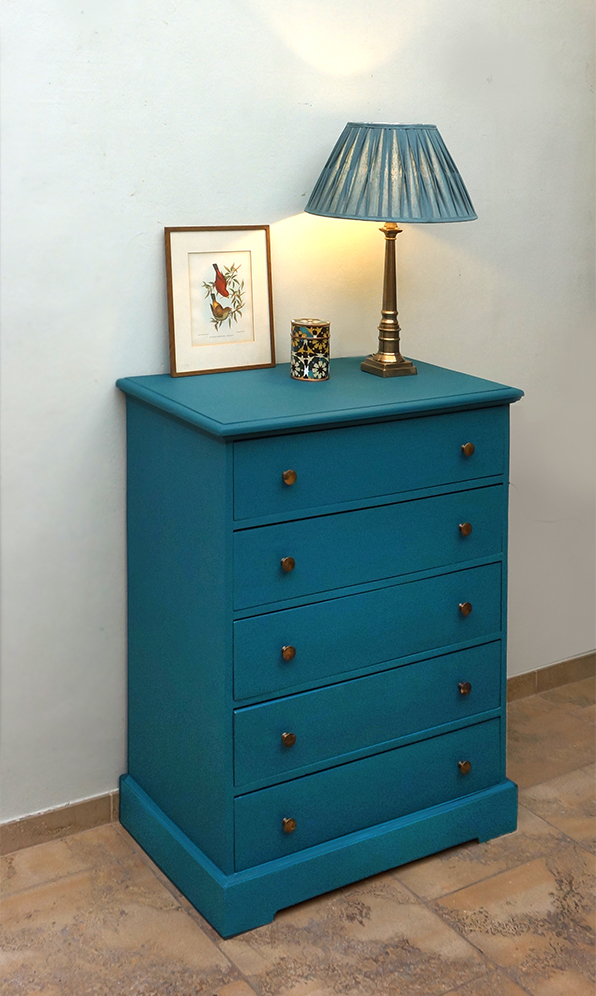 Eine Kommode aus Massivholz mit 5 Schubladen in einem attraktiven türkis gefasst. Die Schubladen praktisch und elegant lassen sich leicht öffnen mit den Messingknäufen. Die Kommode zeichnet sich durch Ihre Geradlinigkeit und intensive Farbigkeit aus. Die Oberfläche ist versiegelt und kann alltäglich strapaziert werden.