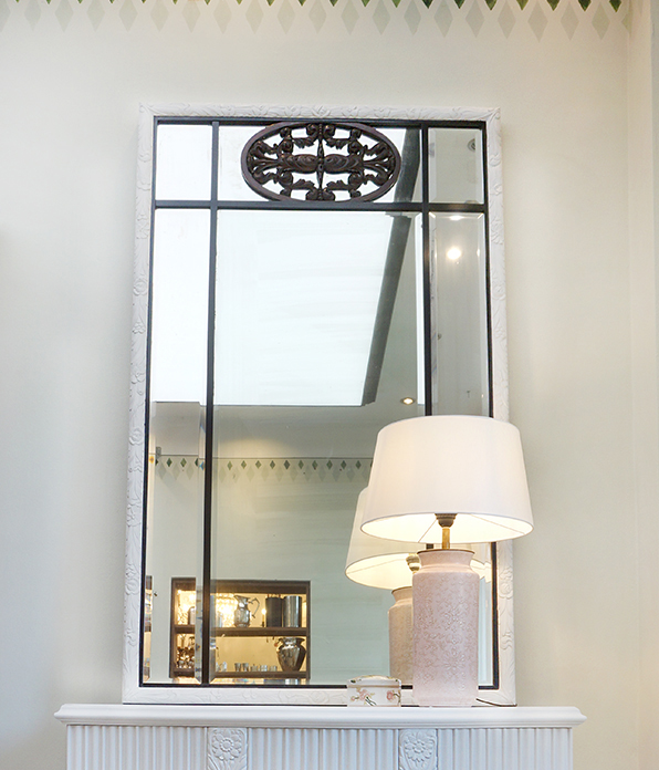 Der Spiegel besitzt umlaufend eine schöne blumige Bordüre, einen hochwertigen Facetteschliff mit Holzkassettierungen und einem außergewöhnlichen Medaillon aus Holz im Kopf. Eine besondere Verschönerung in Badezimmer, Eingangsbereich oder im Schlafzimmer.