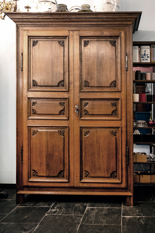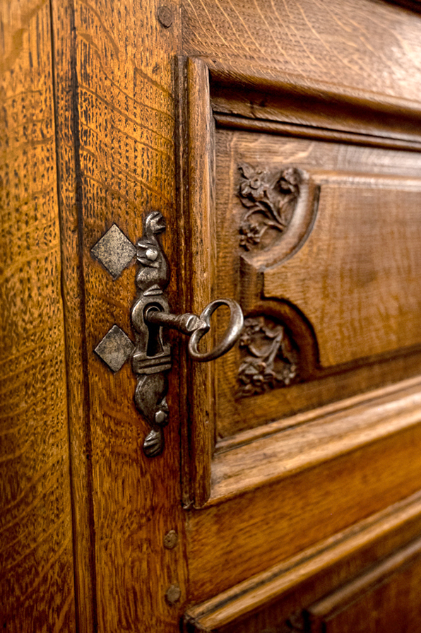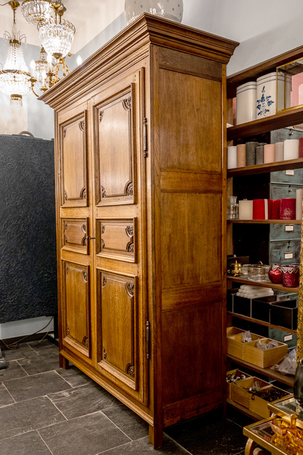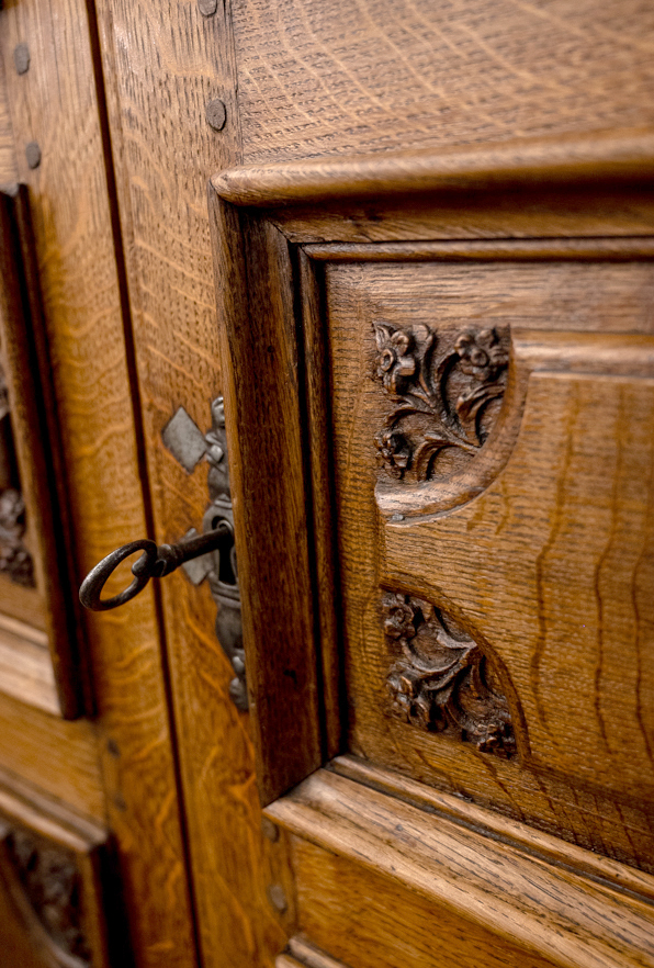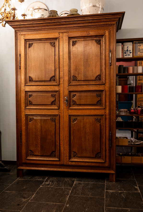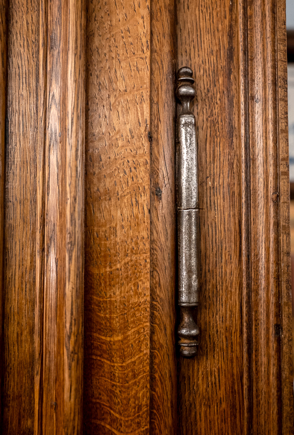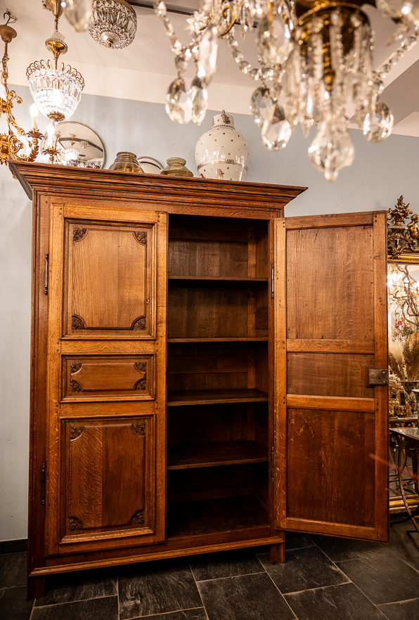 Ein schöner, sehr alter Schrank aus Eiche um 1780. Auffallend ist das massive Holz, die geschnitzten Blüten in den Kassetten und die eisernen Scharniere der Türen samt Schloss, Beschlag und Schlüssel. Insgesamt steht der Schrank mit geradlinigem Korpus. Die Türen sind dreifach gefeldert. Innen bieten 4 massive Böden ausreichend Stauraum für ihre Wäsche, Bücher, Porzellan. ... Dieser Schrank hält sein Versprechen seit 250 Jahren, er wird die nächsten 250 Jahre zu Ihren Diensten sein.