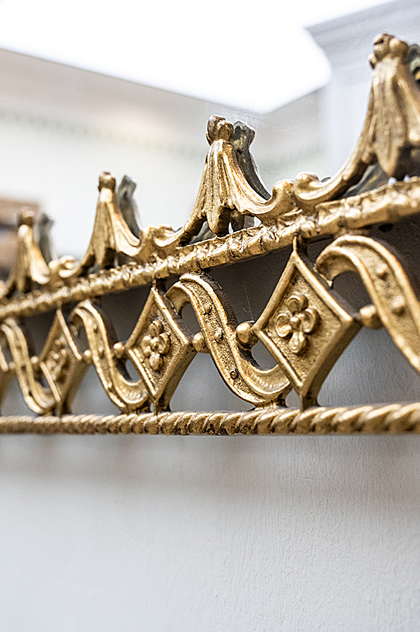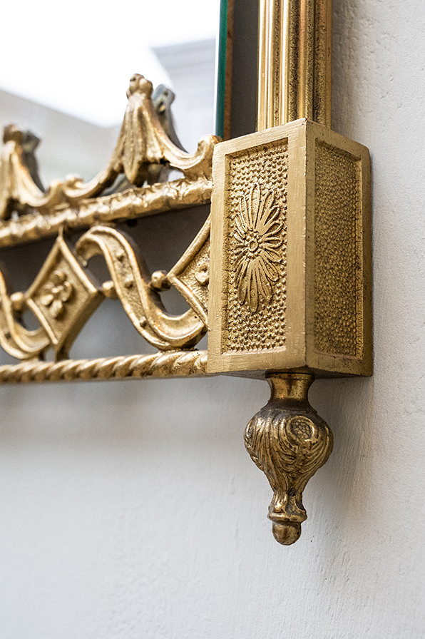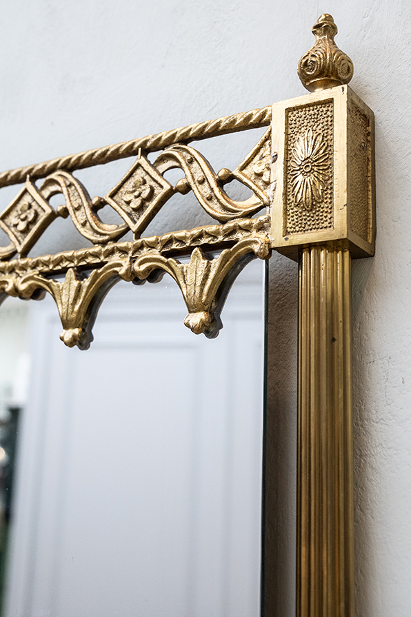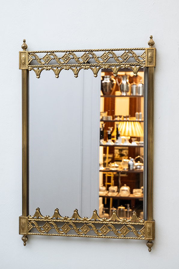 Eleganter Wandspiegel mit aufwendig gearbeiteten massiven Messingrahmen. Die filigranen Ornamentbänder mit Rauten- und Rankenmotiv verleihen dem Stück eine ausdrucksstarke klassische Note. Mit seiner kunstvollen Gestaltung eignet er sich ideal als dekoratives Element im Wohn- und Badbereich und verbindet Funktionalität mit stilvollen Charakter.