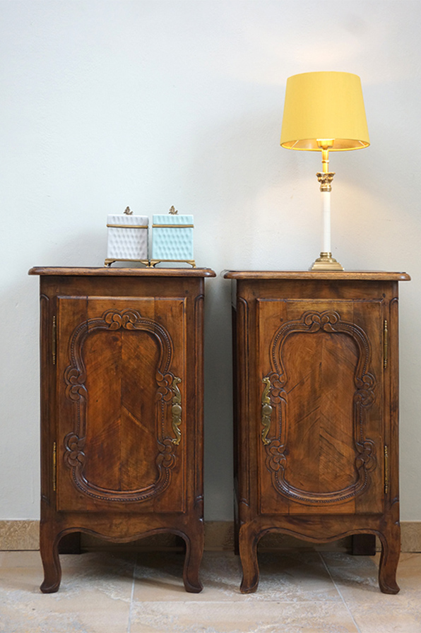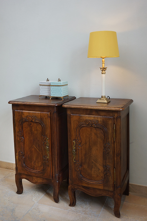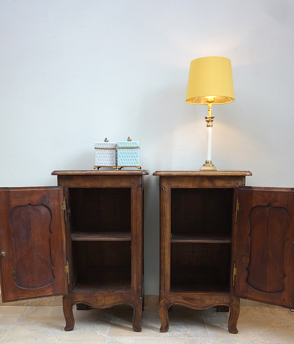Wohl um 1900 nach altem Vorbild hergestellt, sind diese süßen Nachttische ein Augenschmaus! Die Türen schließen gegenständig mit einem Türschnapper.
