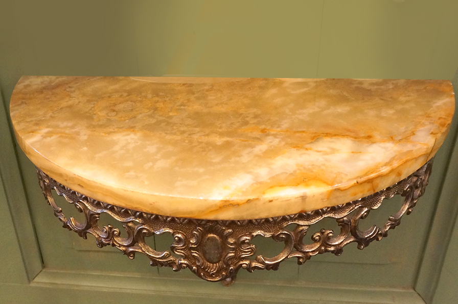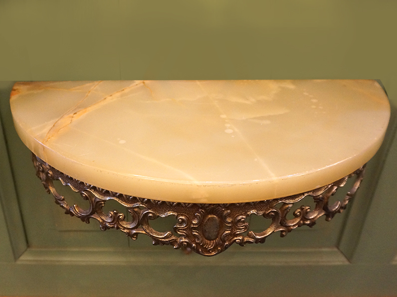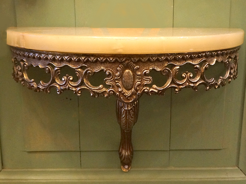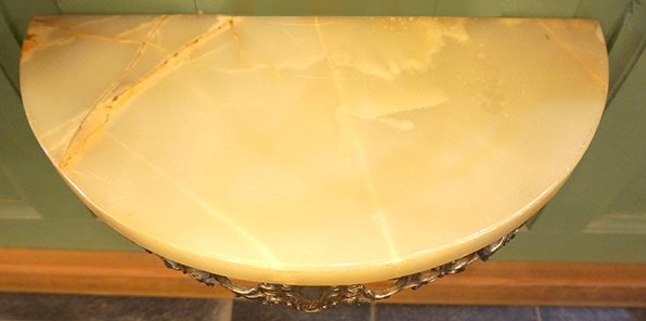 Schöne kleine Onyx-Konsole. Ein Messinggestell hält die Platte. Als kleiner Helfer bzw Ablage, aber auch als Nachttisch-Konsole geeignet. Wunderschön die Lindgrüne Zeichnung im Naturstein Onyx. Auch als Paar erhältlich.