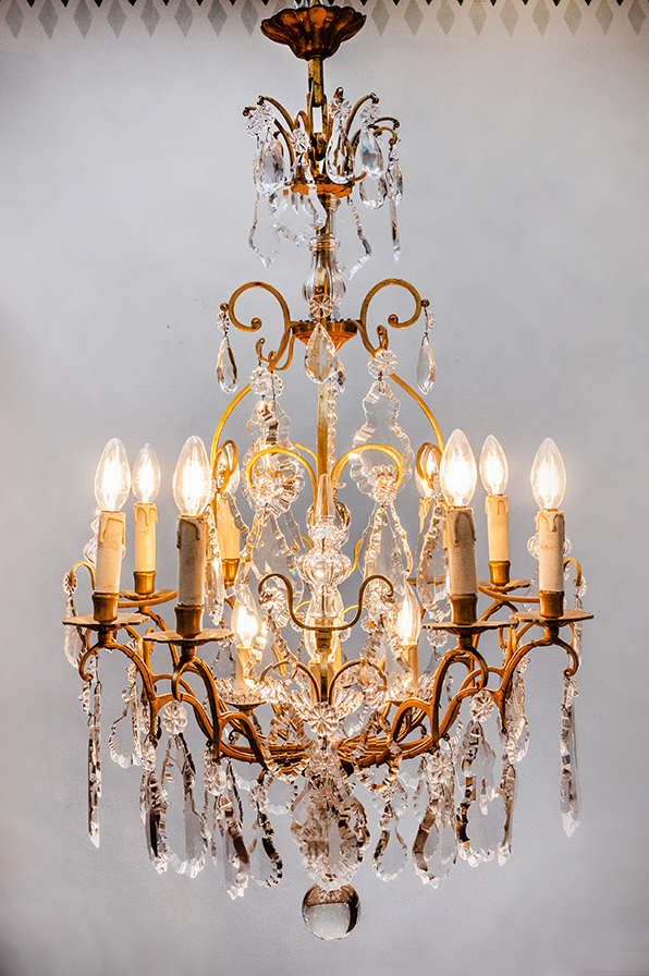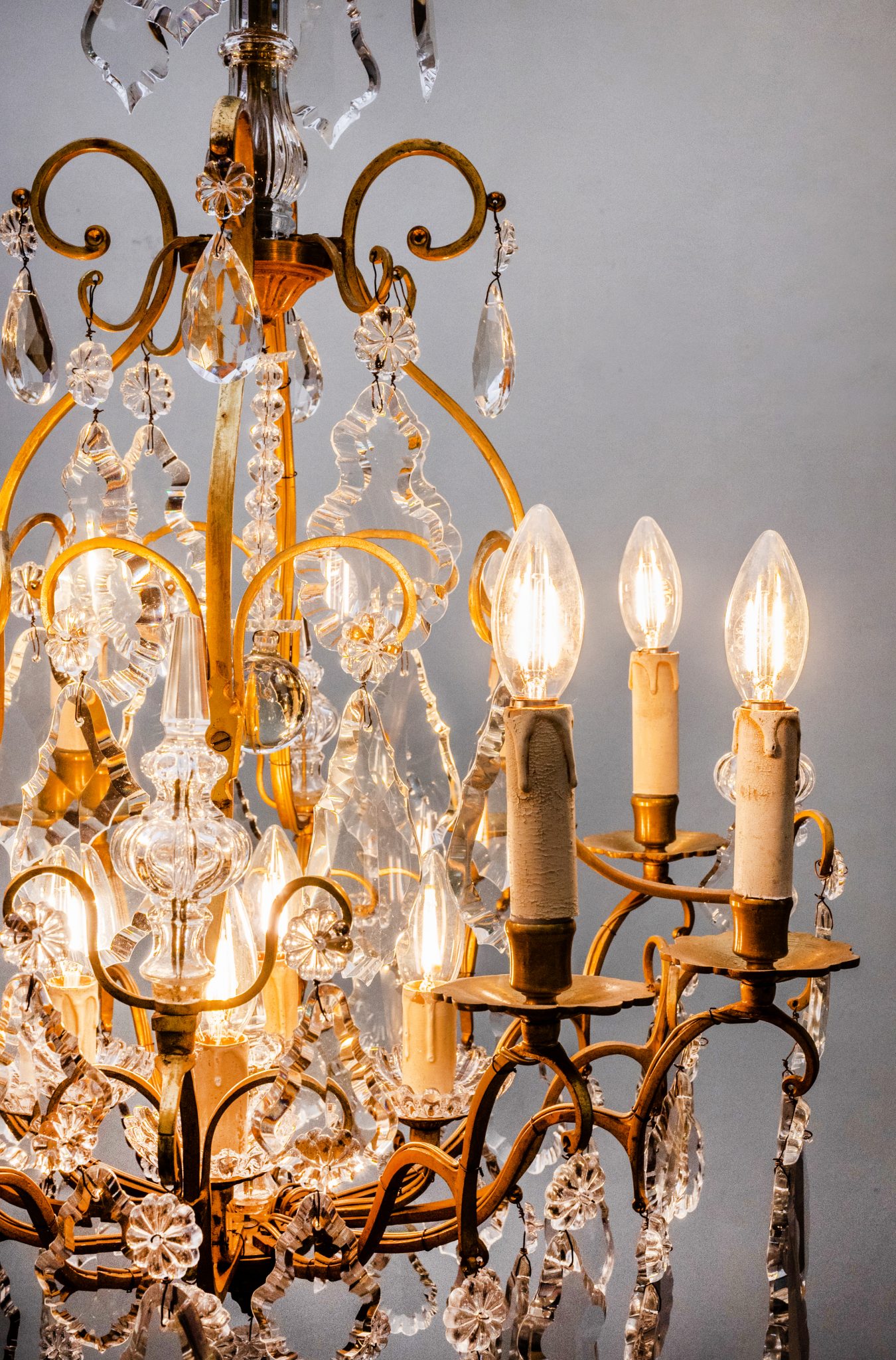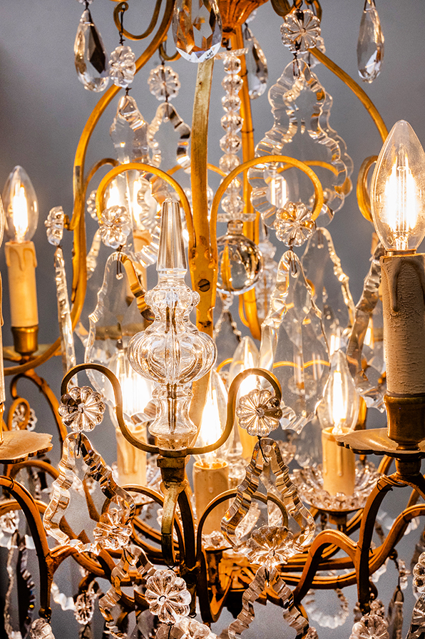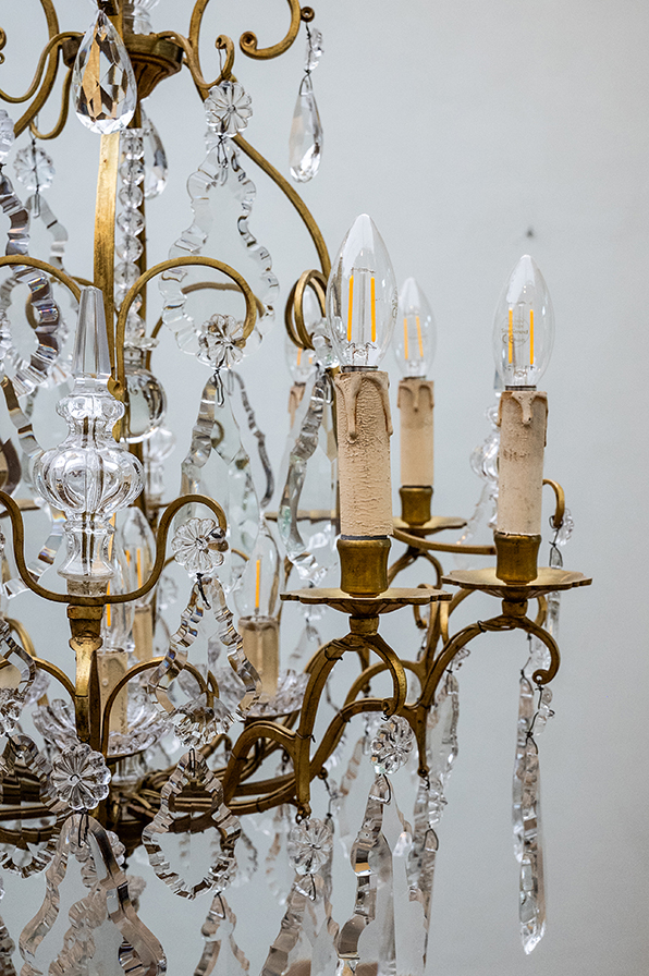 Dieser prachtvolle Kristalllüster besitzt einen filigran geformten Messingkorpus mit ausschwingenden Armen und reichem Kristallschmuck, teils in zierlichen Formen. Die 8 Leuchtmittel (E14) sind außen angeordnet, gepaart mit insgesamt 4 Kristallspitzen und 4 Leuchtmittel innen mit geschwungenen Kerzentellern. Den Deckenabschluss bildet ein profilierter Baldachin.
