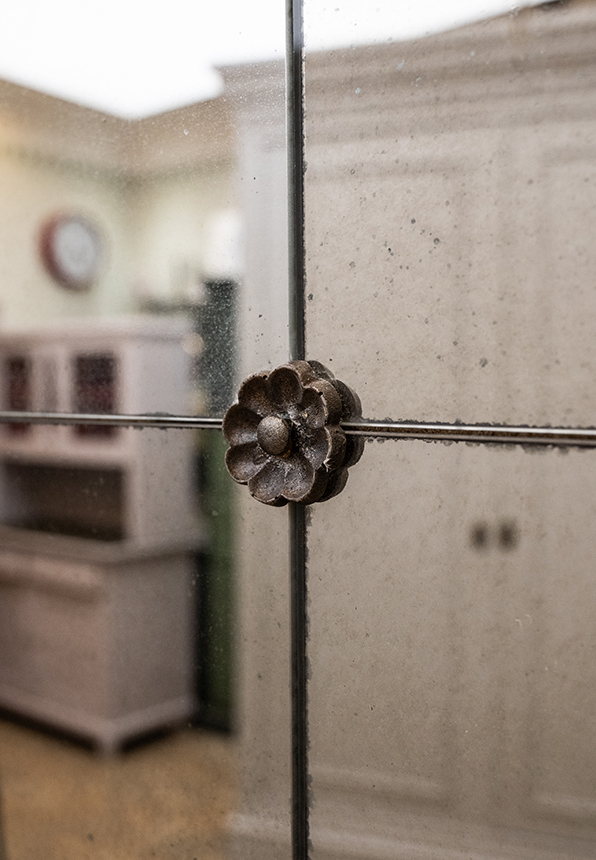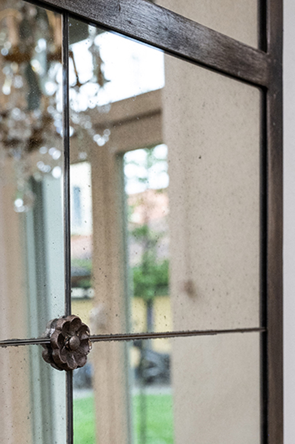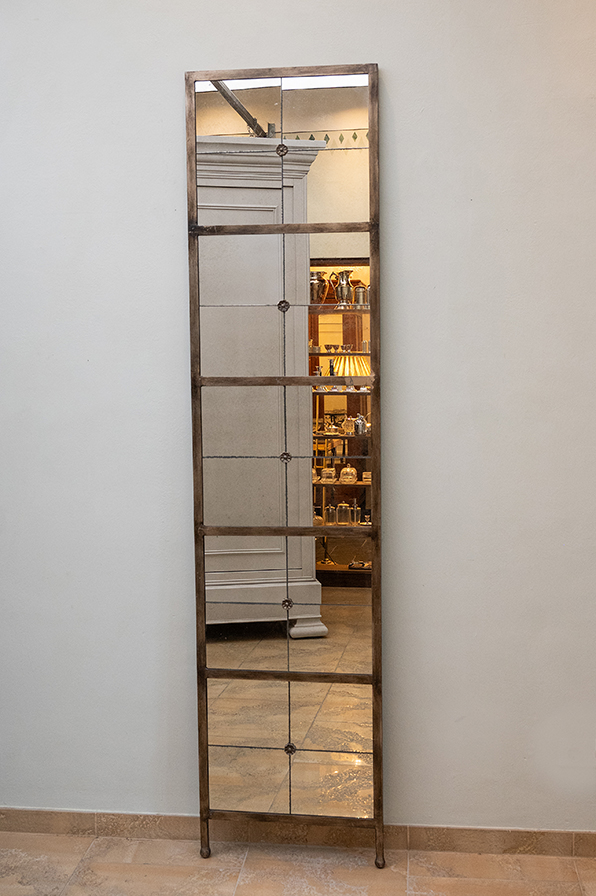 Das Spiegelpaneel bringt Licht in noch nicht bedachte Flächen. Durch die Spiegelsegmente wird das im Raum vorhandene Licht reflektiert. Der Rahmen besteht aus patiniertem Eisen. Die quadratischen Spiegelsegmente sind bekrönt durch eine kleine Blume. Das Paneel wird angestellt und an die Wand gelehnt.