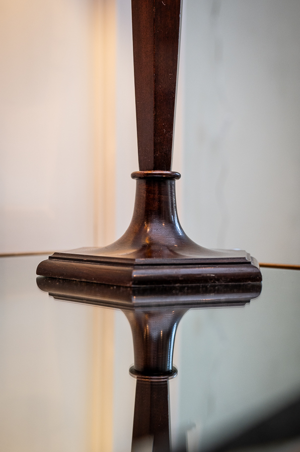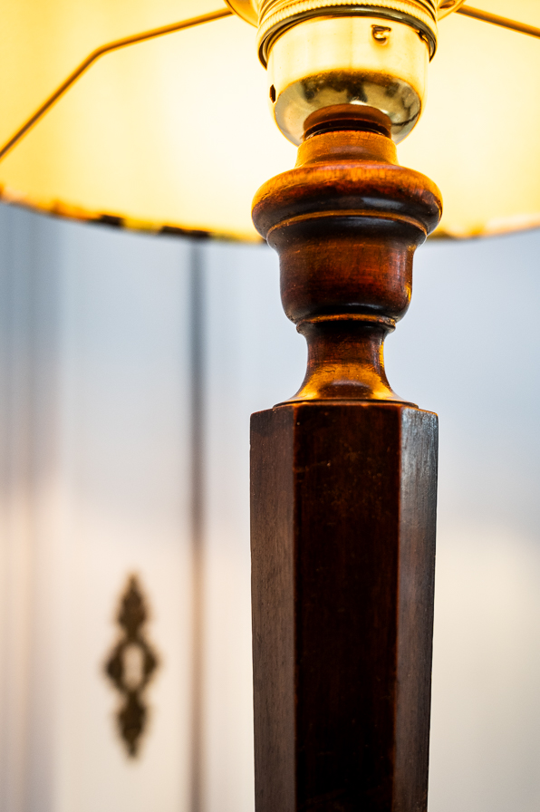 Eine schöne klassische leuchte aus Nußbaumholz. Der lange kantige Schaft ruht auf einem sechseckigen Fuß. Ausgestattet ist diese antike Leuchte mit einem Eisengewicht im Fuß, einem 2m langem Schnurschalter und einer E 27 Fassung. Eine winderschöne leuchte für Fenster oder Anrichte. Angeboten wird die Leuchte mit grünem Schirm.