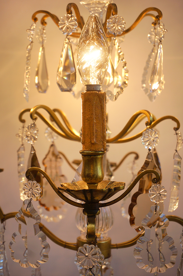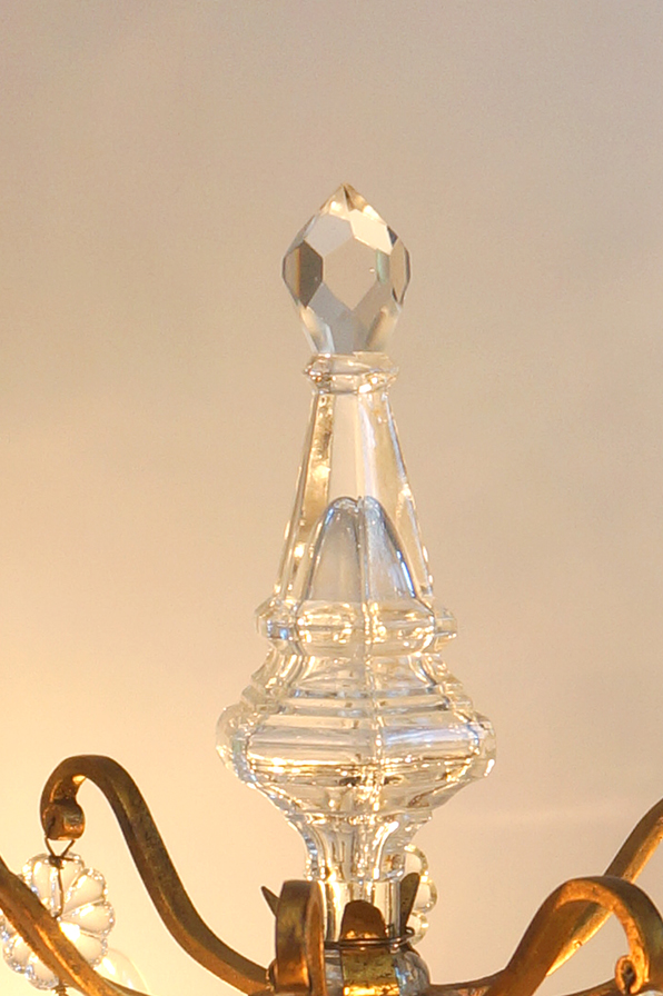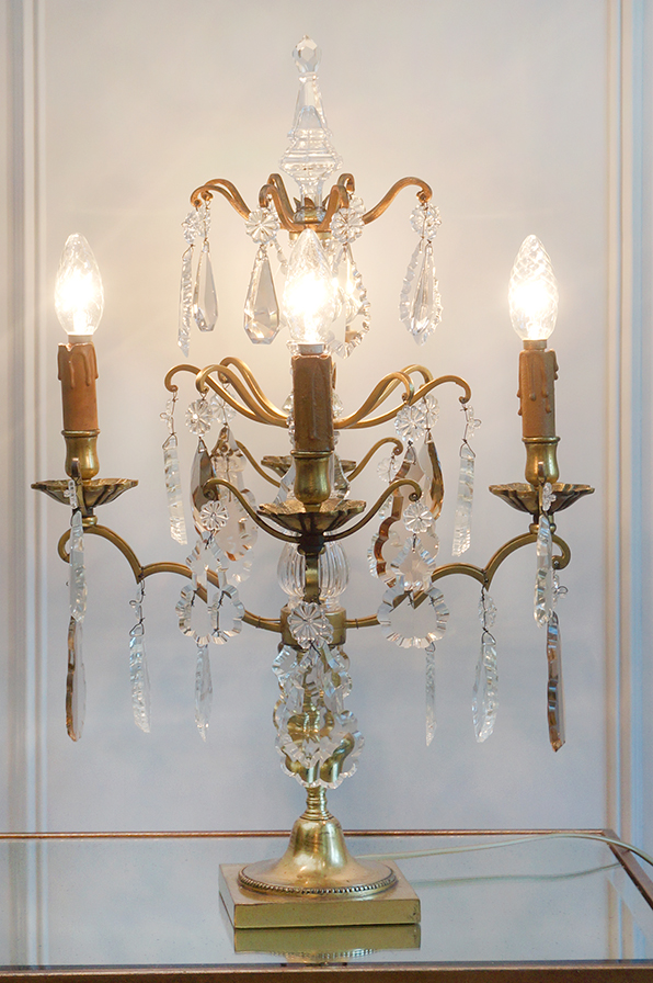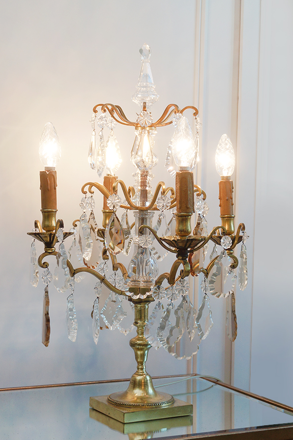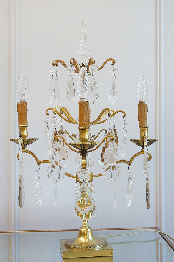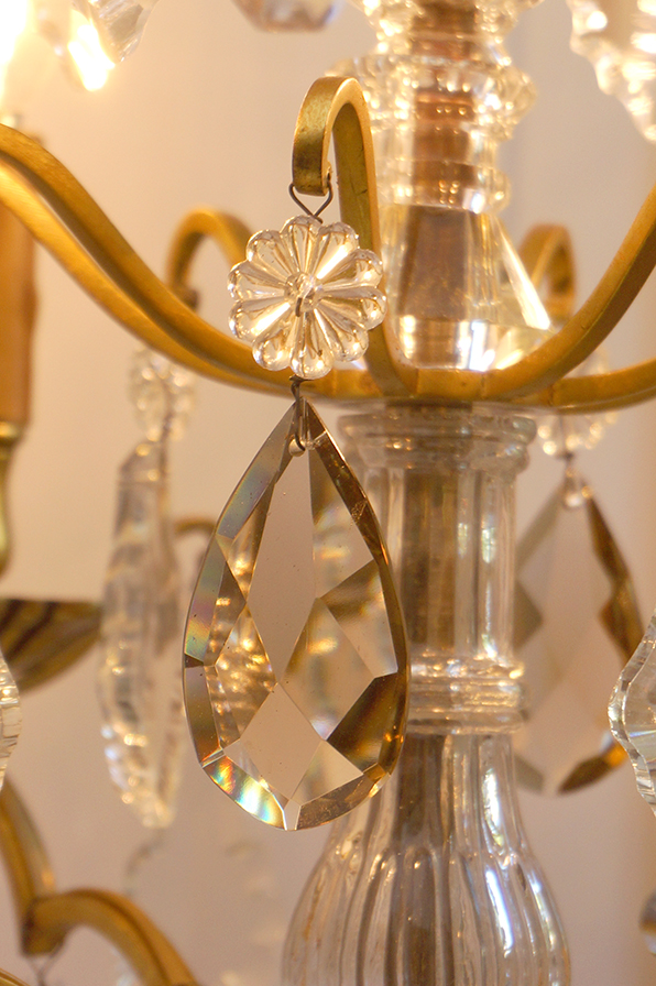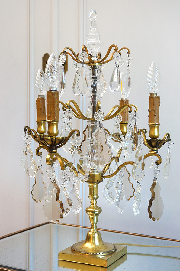 Antike Girandole aus dem Ende des 19. Jhd. Imposant wirkt die solitäre Leuchte mit dem zum Teil handgeschliffenen Kristallbehang und der mittig sitzenden und funkelnden Kristallspitze. Dies steht auf dem Messingfuß mit 4 Armen. Eine hinreißende Lichtquelle sowohl in historisch, als auch in modern gestalteten Räumen.