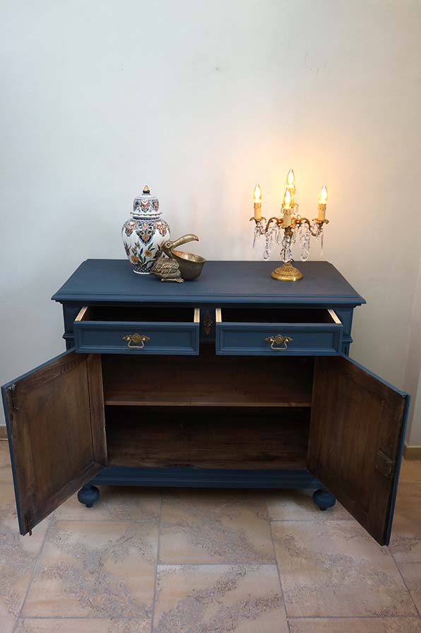 Ein wundervolles petrolfarbendes Schränkchen aus Eiche, welches in der Gründerzeit um 1880 gefertigt wurde. Es besitzt zwei Türen und zwei Schubladen, die jeweils auch verschließbar sind. Ein schmuckes Möbel zum Aufbewahren verschiedenster Dinge. Das Schränkchen wurde liebevoll aufgearbeitet und ist wohnfertig.