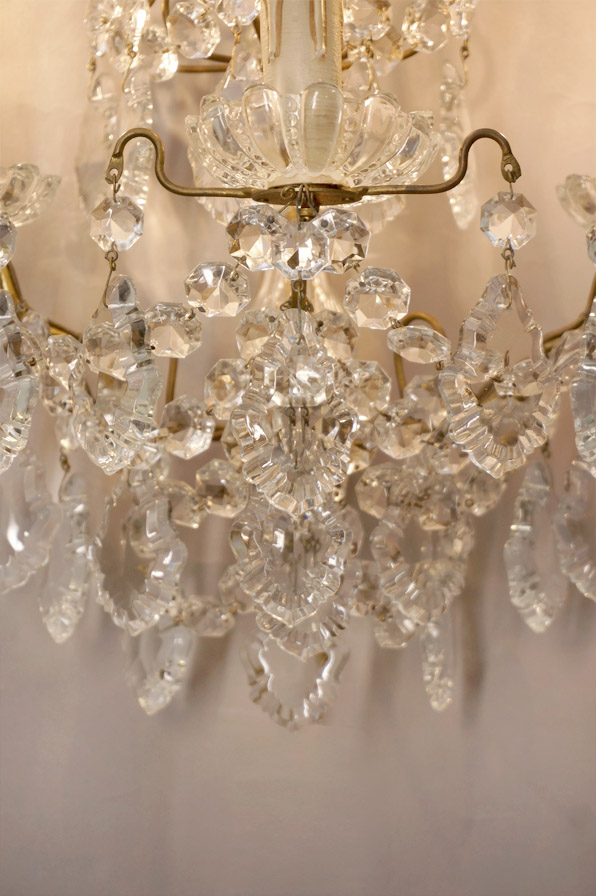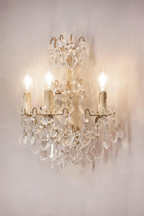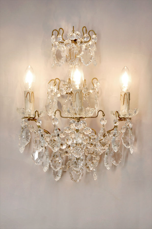 Die historische Wandleuchte ganz aus Kristall besitzt 3 E14 Fassungen und filigranen Behang aus Kristallketten, -blättern und -kerzentellern. Sie ist komplett restauriert und die Elektrik ist neu.